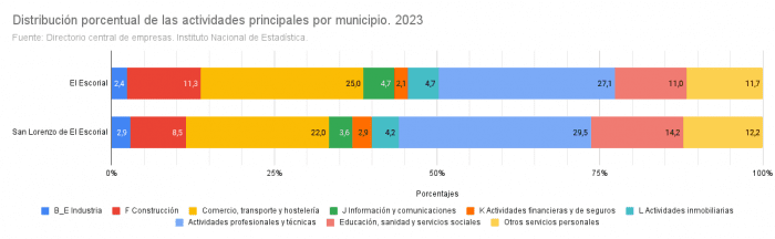El porcentaje comparado de las actividades económicas entre ambos municipios manifiesta el mayor protagonismo económico de San Lorenzo de El Escorial en todas ellas, a excepción de Información y comunicaciones, única en la que destaca El Escorial.