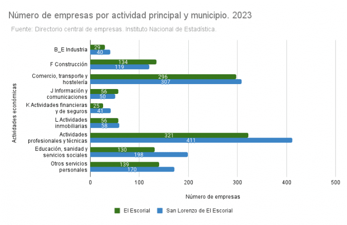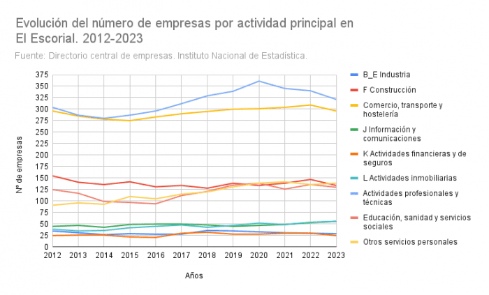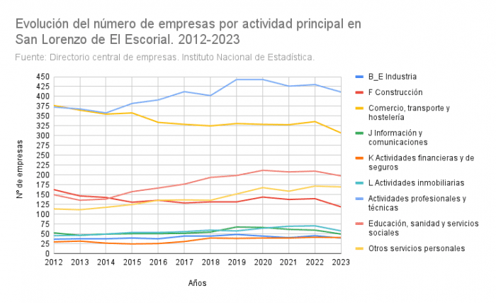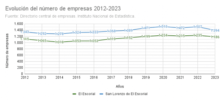 Finalmente destacar que, en términos absolutos, entre 2012 y 2023 las actividades que han padecido una mayor disminución del número de empresas han sido el Comercio, transporte y hostelería con la drástica desaparición de 70 empresas en San Lorenzo de El Escorial, explicable por el cierre de establecimientos comerciales y de hostelería con mala localización, y la Construcción con la reducción de 65 empresas (44 en San Lorenzo de El Escorial y 21 en El Escorial), debida a la saturación de las posibilidades de crecimiento de las Normas Subsidiarias de San Lorenzo de El Escorial y al lento desarrollo del ensanche de El Escorial.