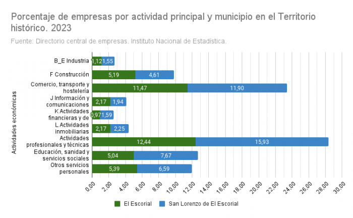 Según el Directorio Central de Empresas del Instituto Nacional de Estadística en 2023 habían 1183 empresas en El Escorial y 1394 en San Lorenzo de El Escorial, que representan el 46 y el 54 % respectivamente del total de 2.580 empresas en el Territorio Histórico.